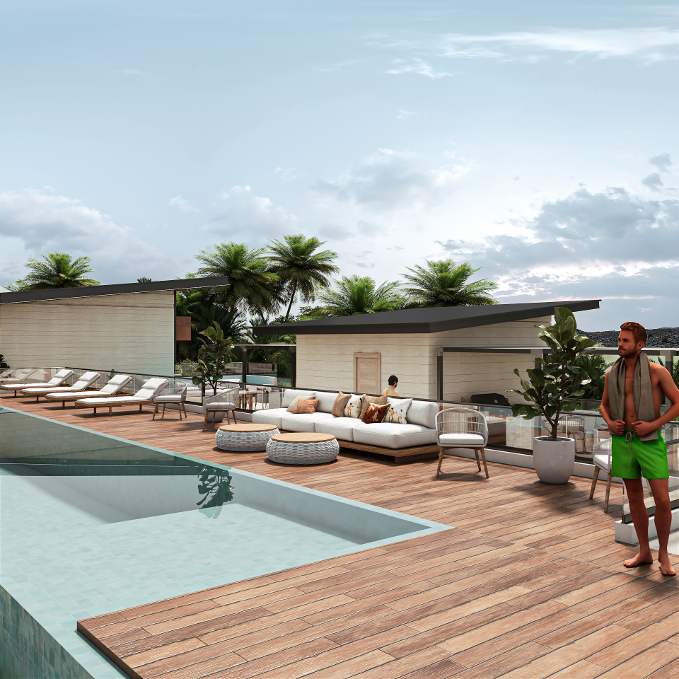 Moving upstairs, the social terrace invites you to relax and connect with neighbors in a casual setting.