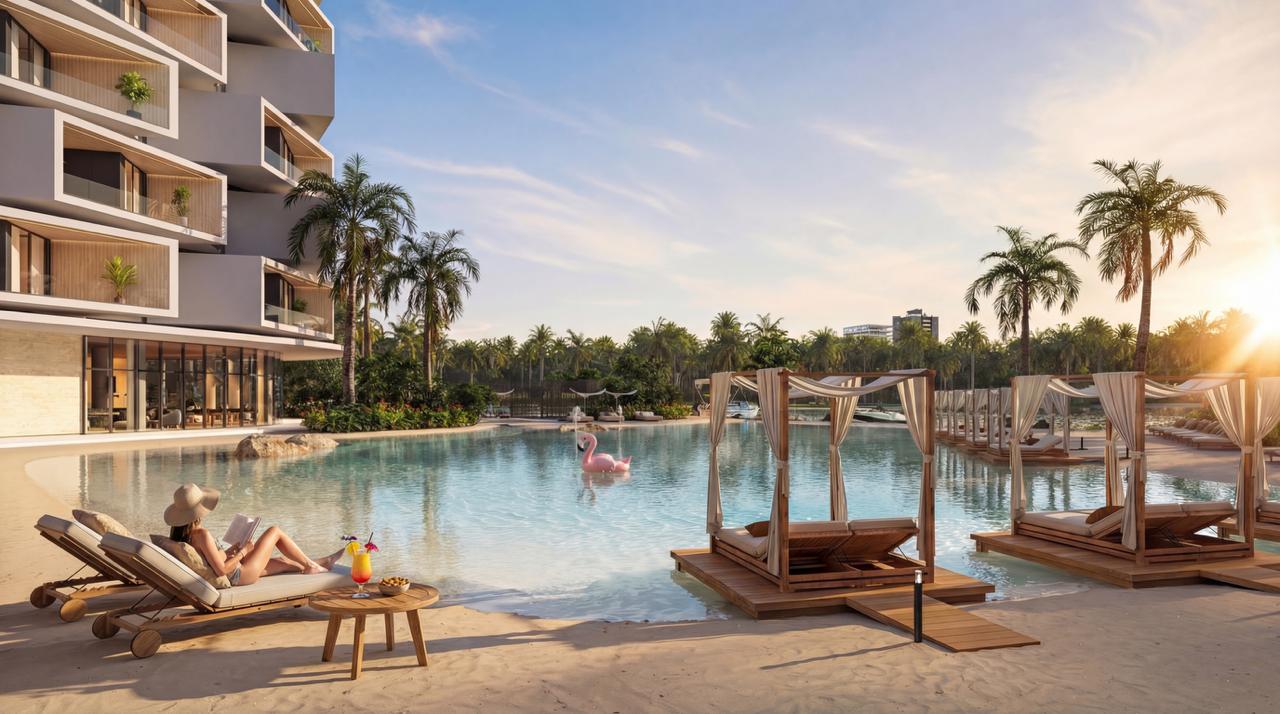 Crystal-Clear Lagoon – A serene artificial lagoon framed by tropical vegetation, perfect for unwinding in style.