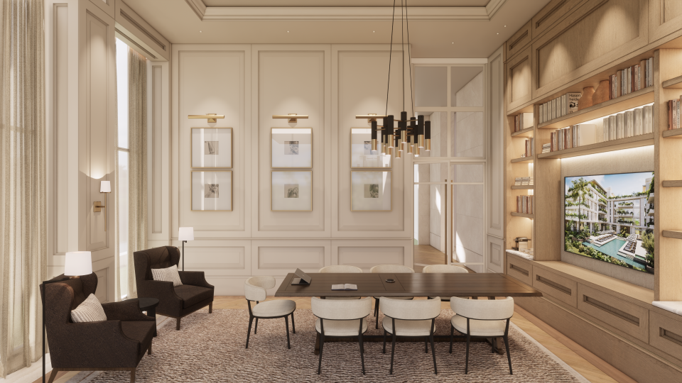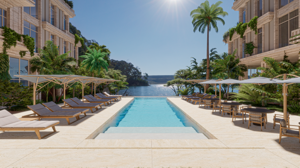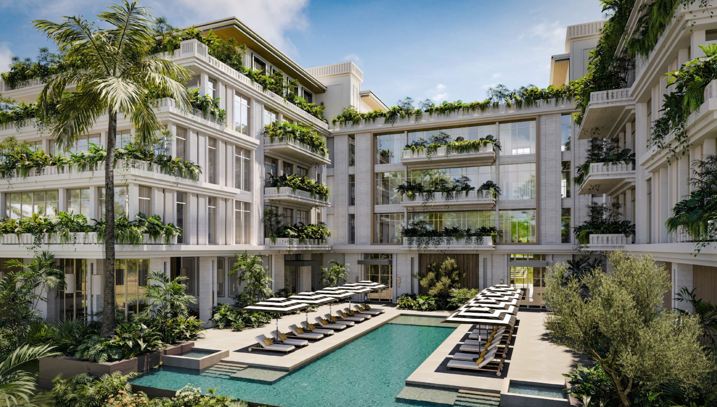 This contemporary neoclassical project rises within lush tropical landscaping that enhances its elegant, natural character. The five-story building features expansive terraces, floor-to-ceiling windows, and refined finishes inspired by the calm Caribbean landscape. Its design maximizes natural light and strengthens the connection between indoor and outdoor spaces. The development elevates residential living in Cap Cana while integrating seamlessly with its natural surroundings.