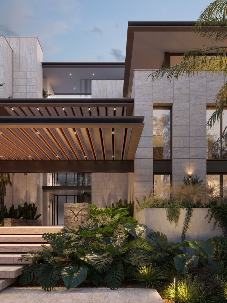 Lush native planting softens every edge. Palms and layered gardens rise along the plinth and spill over elevated planters, guiding the eye from the stepped limestone entry to private terraces above. At dusk, concealed lighting grazes stone and foliage, extending the sense of home outdoors. Architecture and landscape merge into one refined, green, and livable composition—serene and enduring from the moment you arrive.