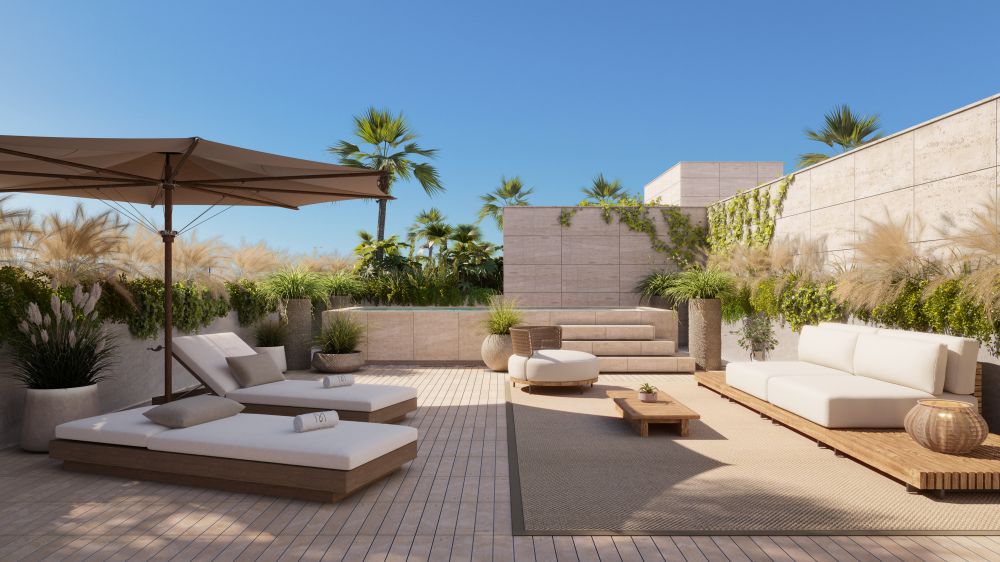 Ground-floor residences feature private jacuzzis set within secluded garden terraces.