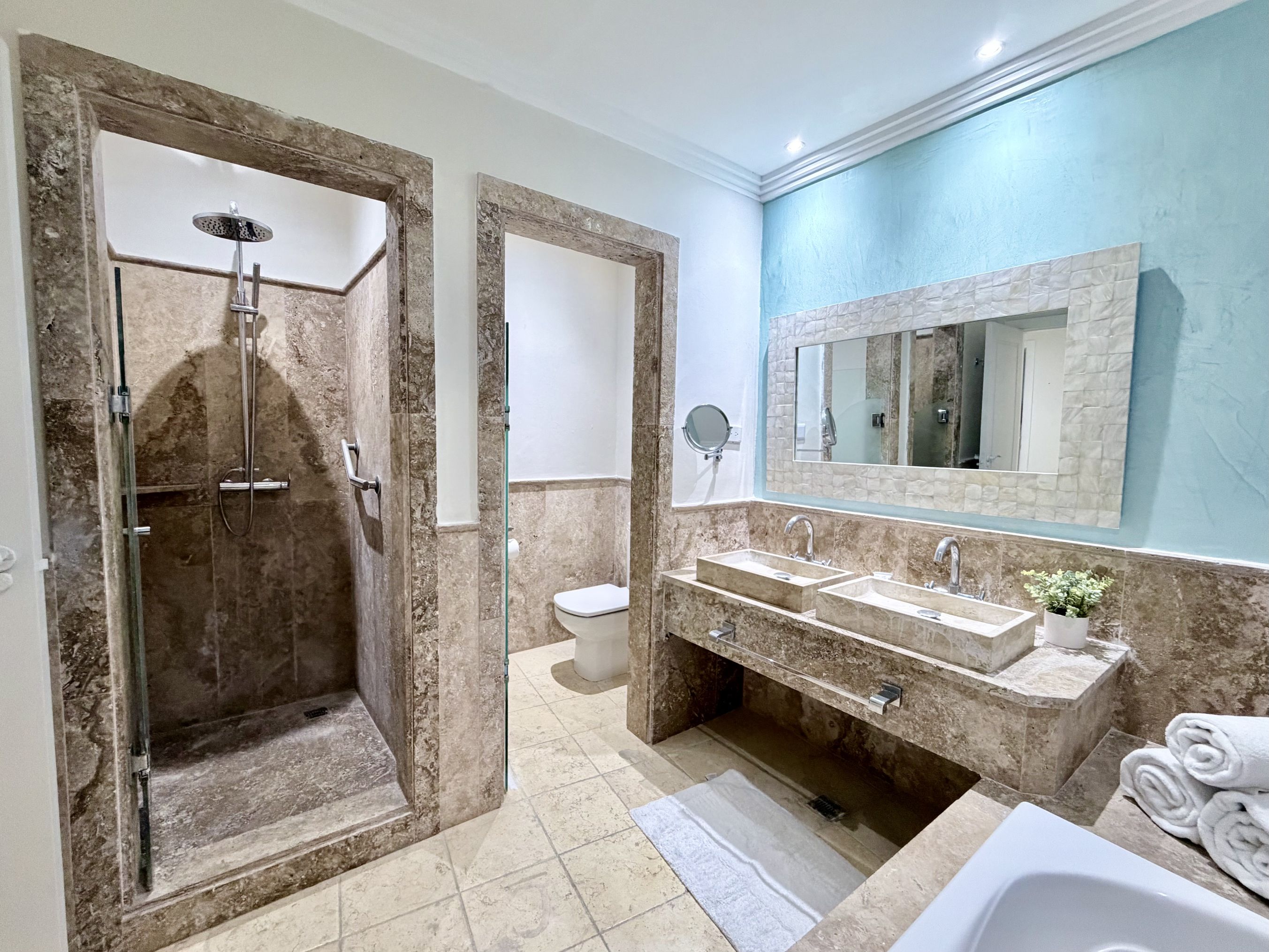 The condo includes two master bedrooms, each with a shower, bathtub, and dual sinks, plus a guest bedroom with a shower and sink.