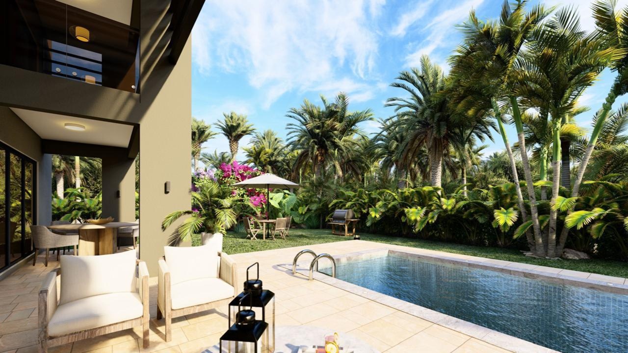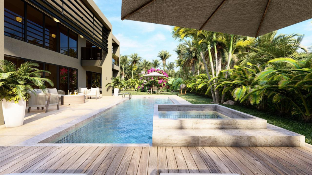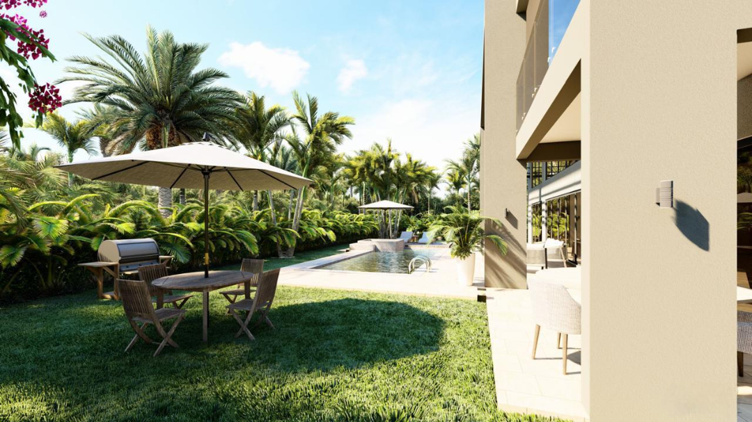 The social areas open directly onto a generous outdoor terrace and swimming pool, surrounded by landscaped green spaces—perfect for enjoying Cap Cana's tropical lifestyle.