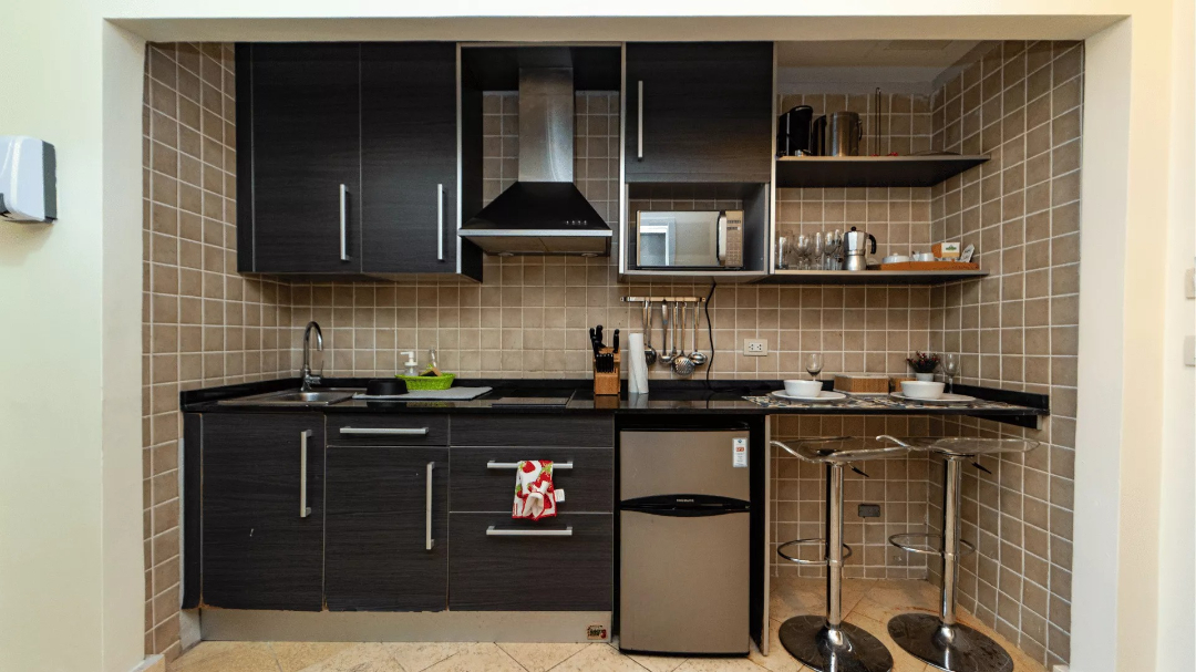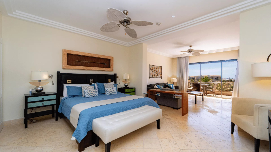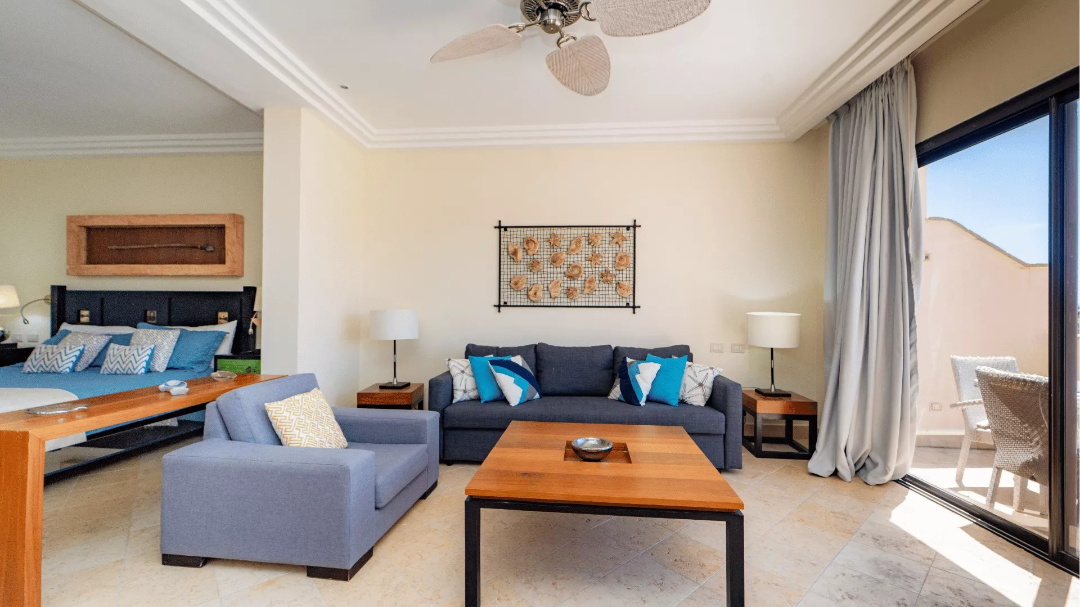 The second unit is a private studio with its own separate entrance, a kitchenette, and a combined living and sleeping space. It also includes a private terrace with equally impressive views of the marina and pool area.